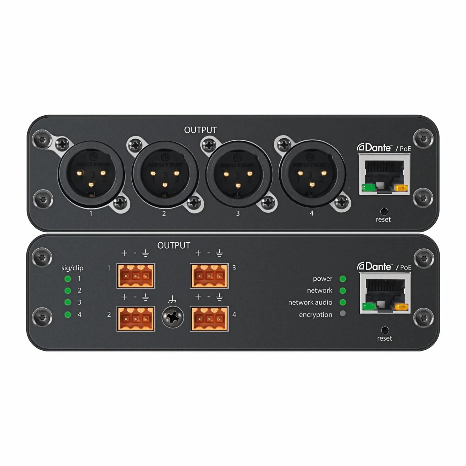 Converts Dante™ digital audio signal to four discrete line / mic analog signals.