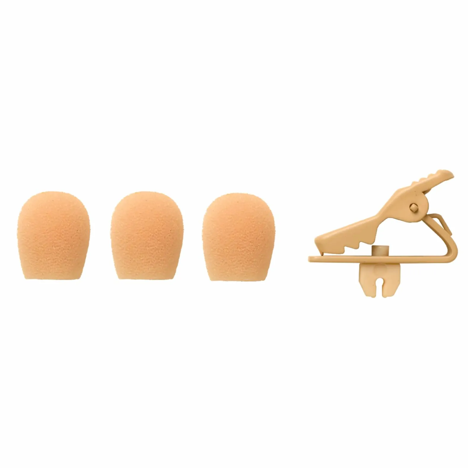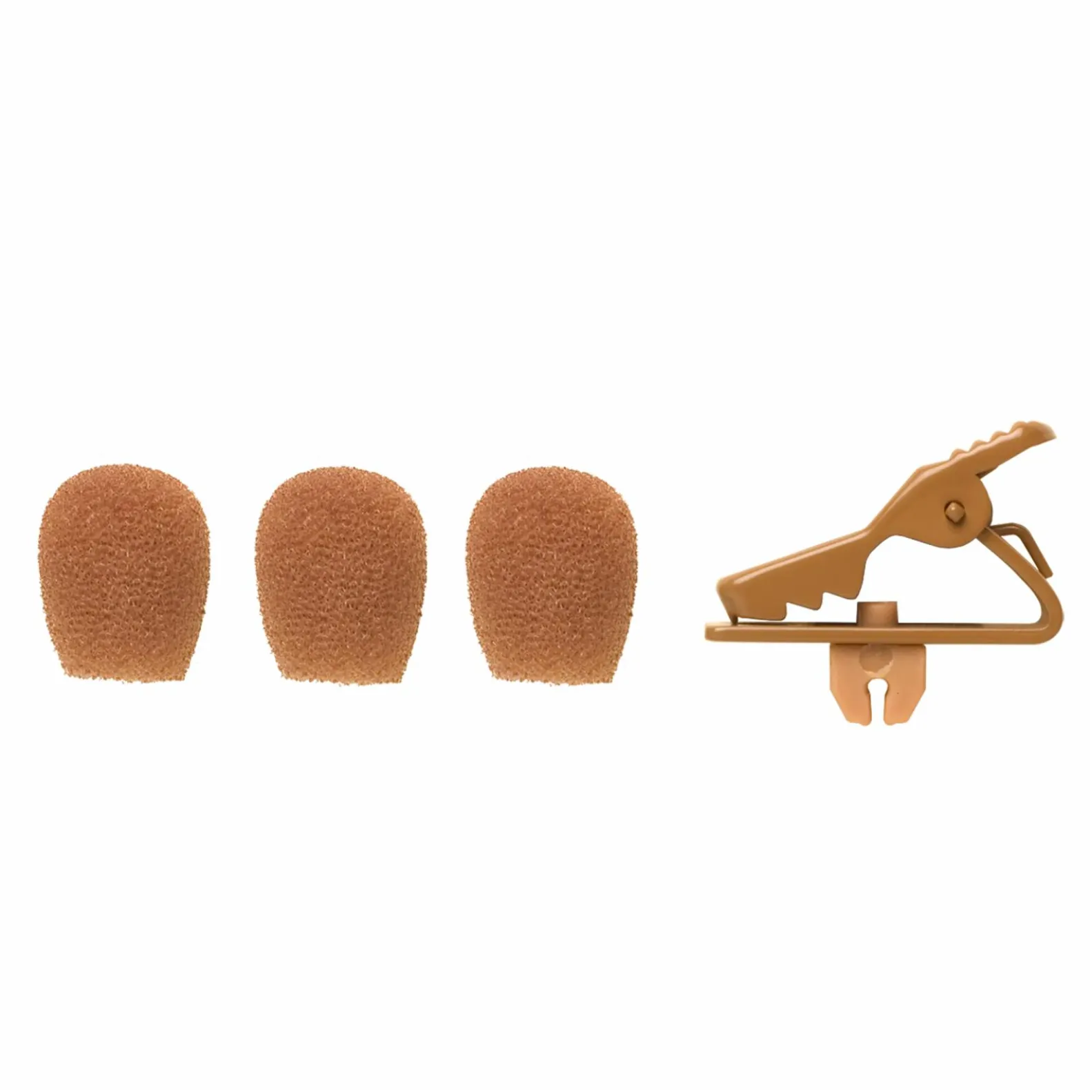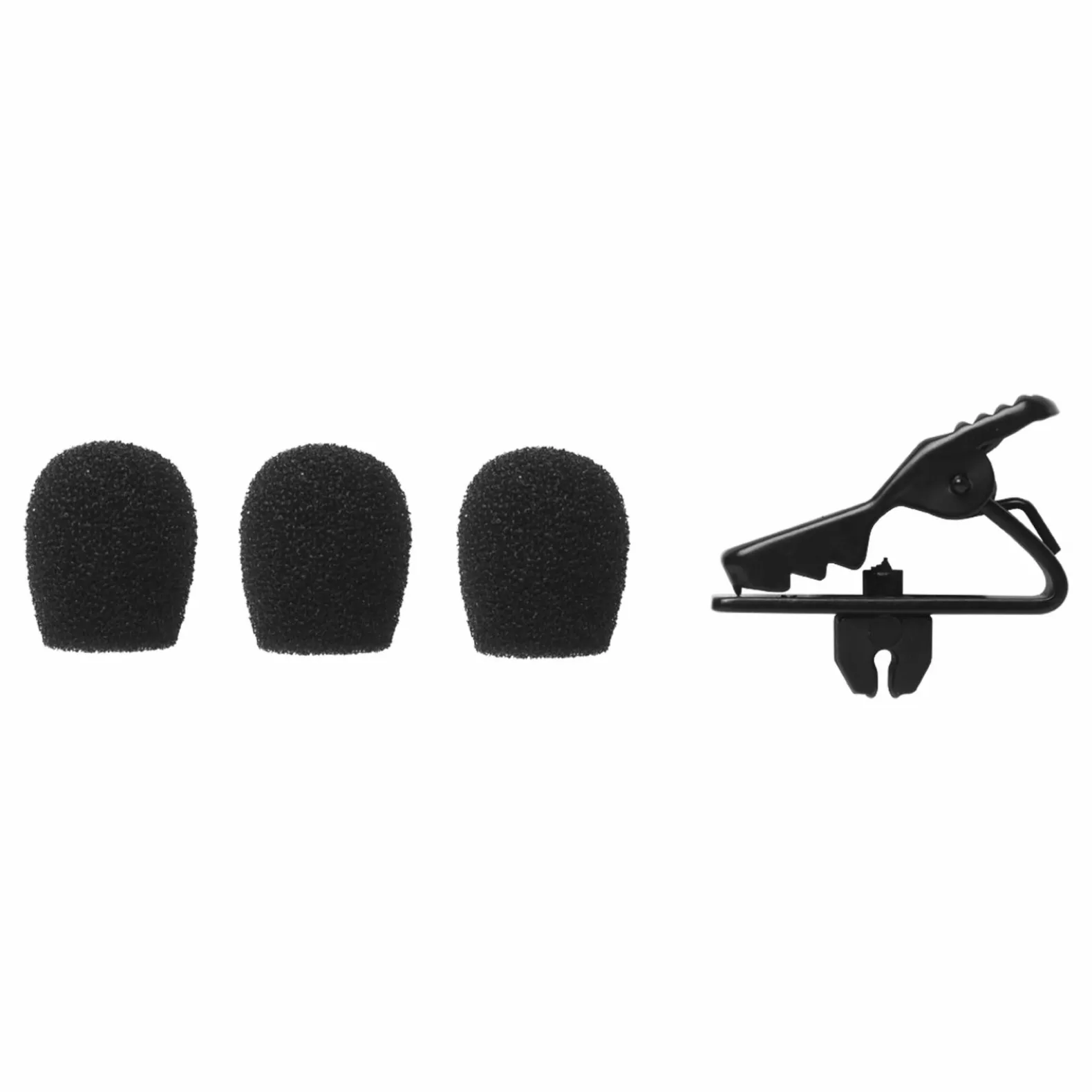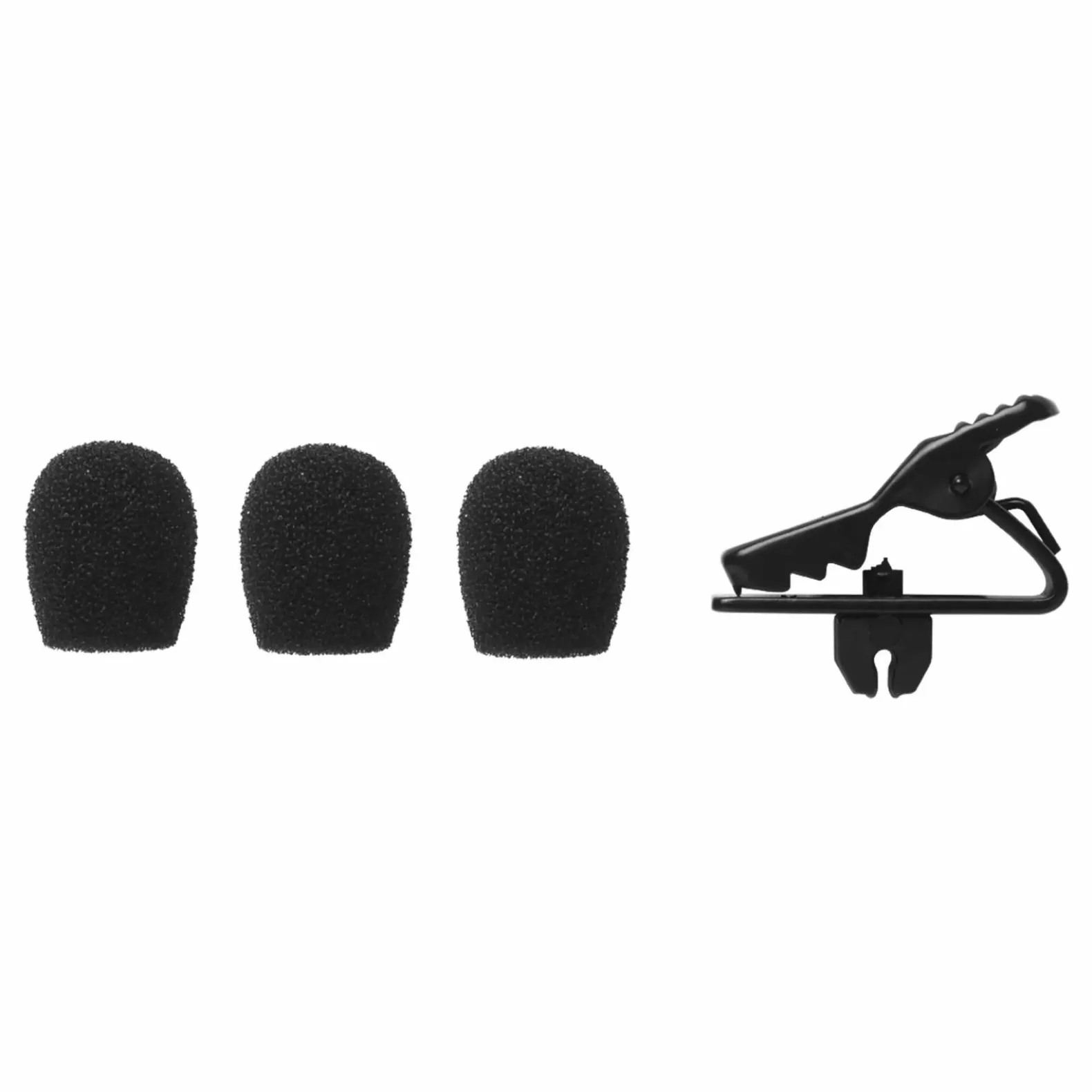 Windscreen and collar clip reduce unwanted ambient noise and secure microphones to clothing when used with an MX153 Microphone.