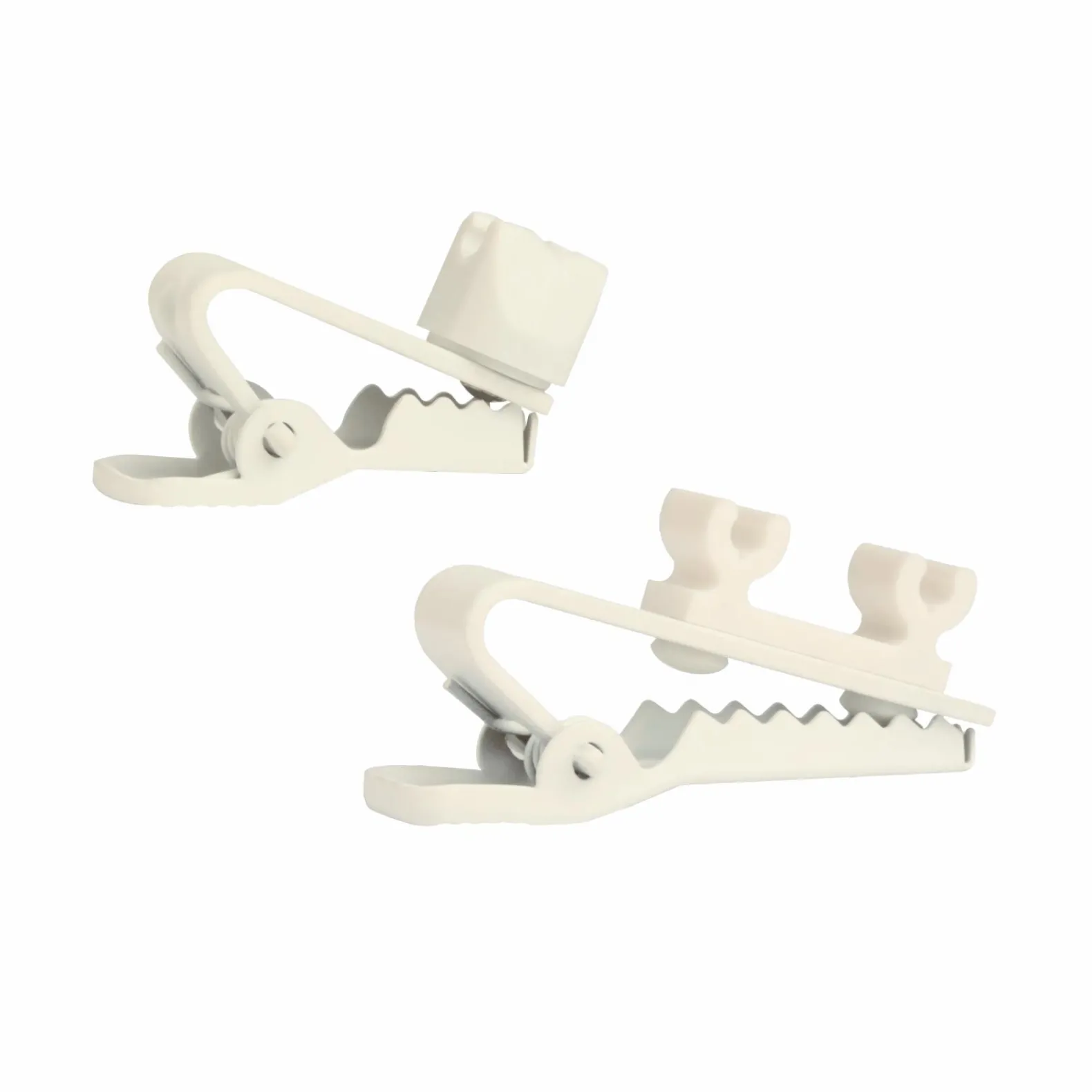 Single and dual tie clip secures WL50 and WL51 microphones to clothing.