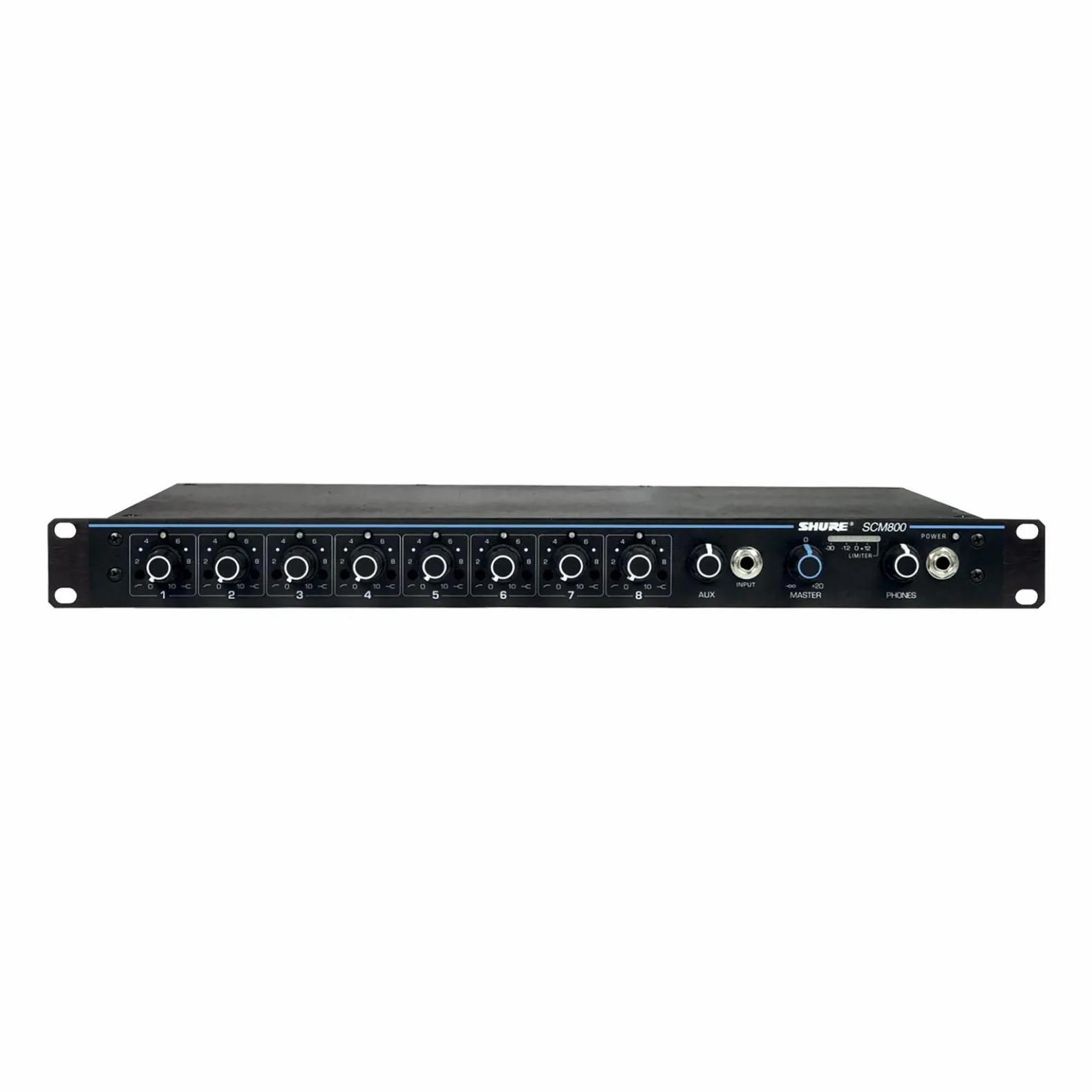 The Shure Model SCM800 is a full-featured, eight-channel microphone mixer for sound reinforcement, general audio recording, and audio-visual systems. Any low-impedance, balanced dynamic or condenser microphone, including a wireless microphone system, can be used with the SCM800 mixer.