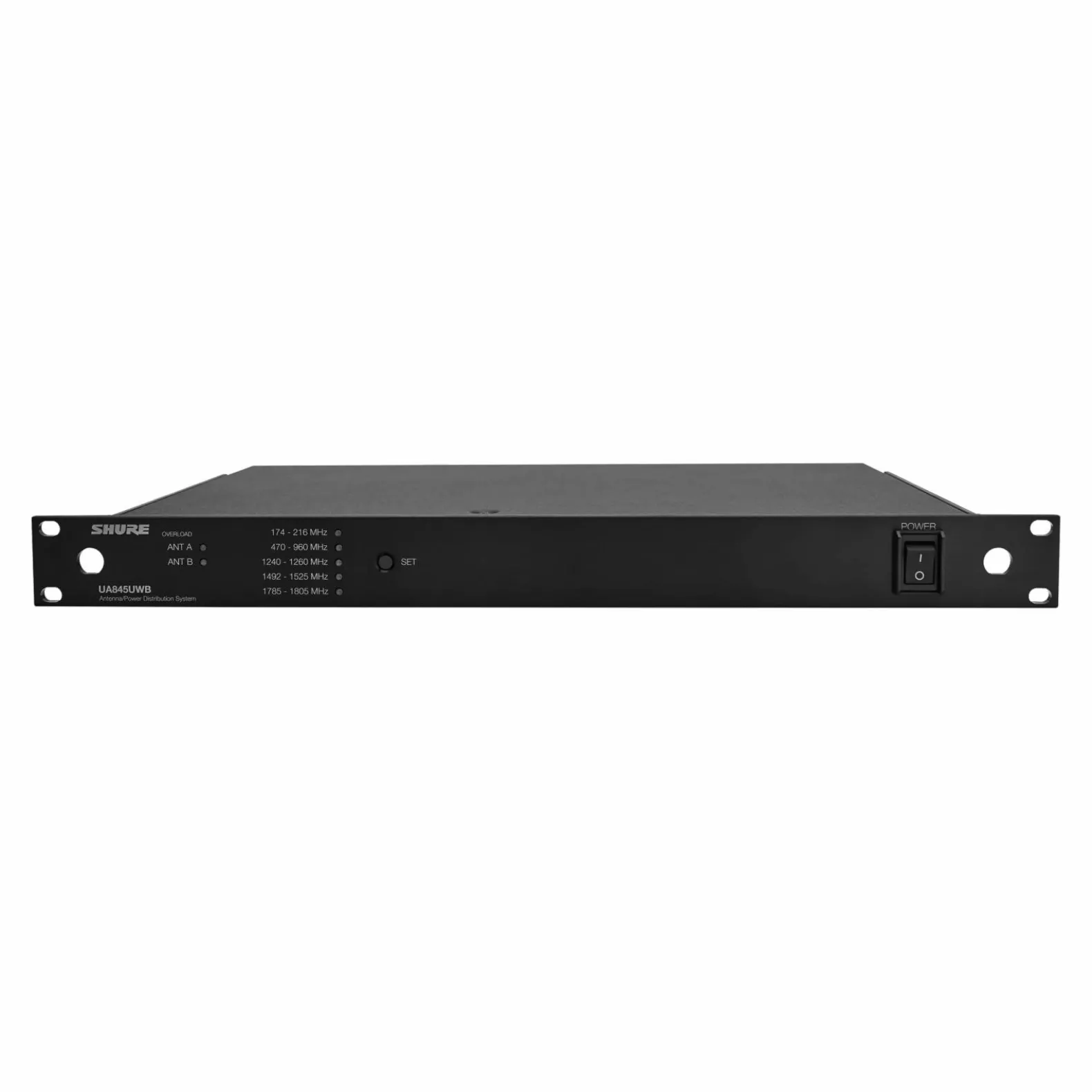 The Shure Model UA845UWB is an amplified, VHF and UHF Antenna Distribution System that expands a wireless microphone system by splitting one pair of antennas to multiple Shure Axient Digital, UHF-R, ULX-D, BLX4R, SLX4 and BLX4R. It also amplifies RF signals to compensate for insertion loss due to splitting signal power to multiple output connectors. Each UA845UWB allows up to four receivers to use the same antennas. CASCADE connectors allow connections to a fifth receiver or a second UA845UWB.