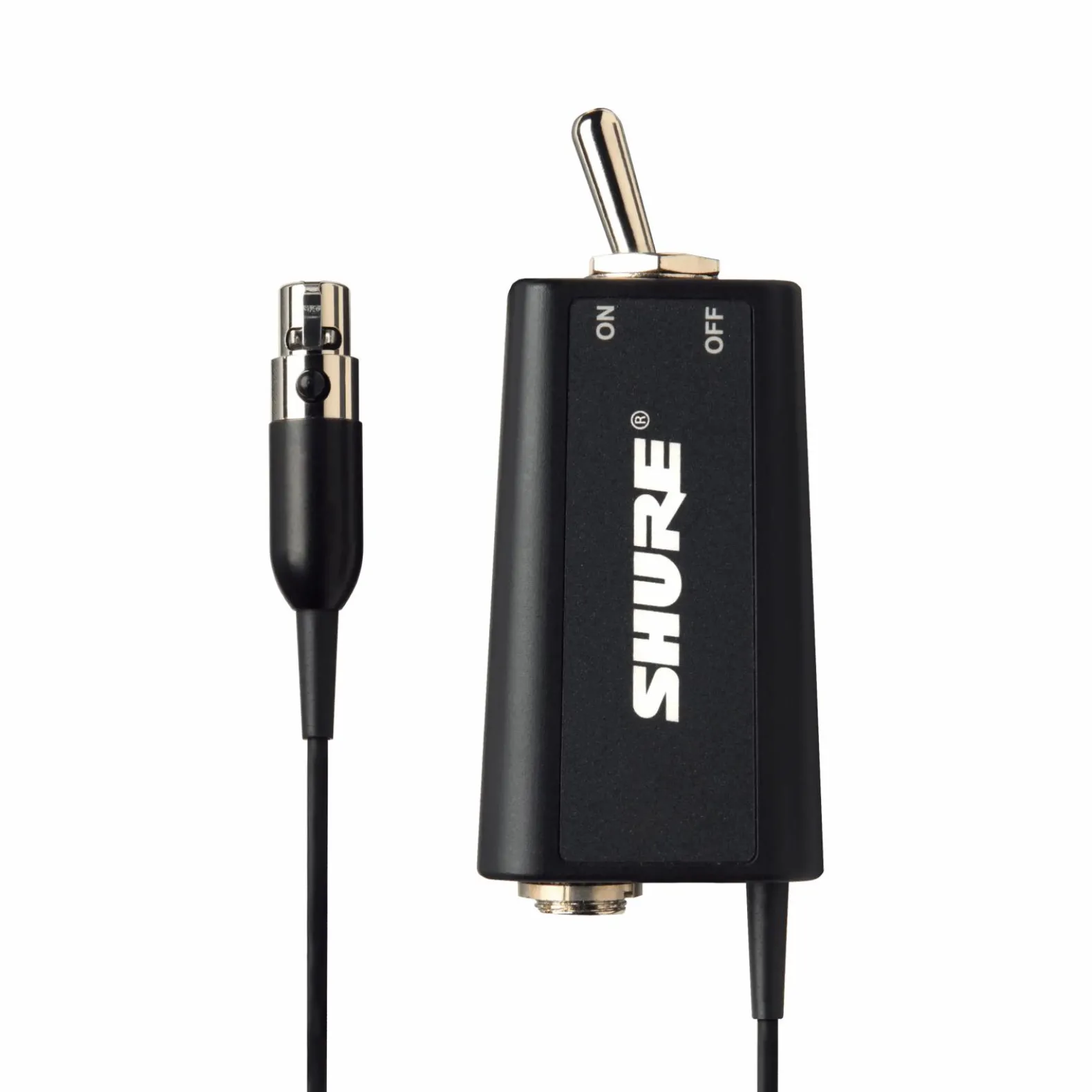 In-line bodypack mute switch allows the performer to easily mute a bodypack transmitter.