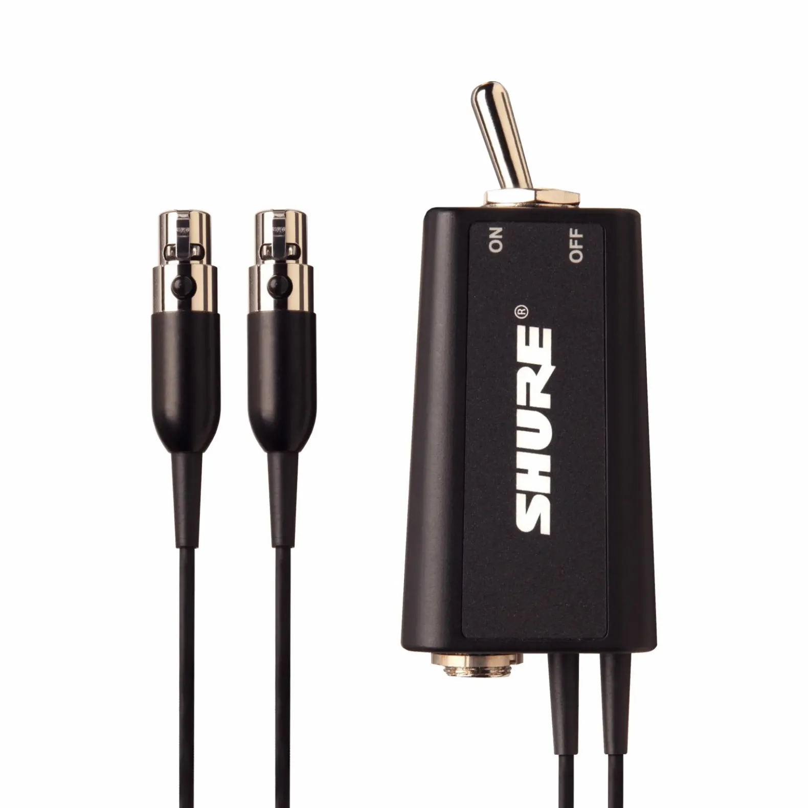 In-line bodypack mute switch allows the performer to easily mute 2 bodypack transmitters.