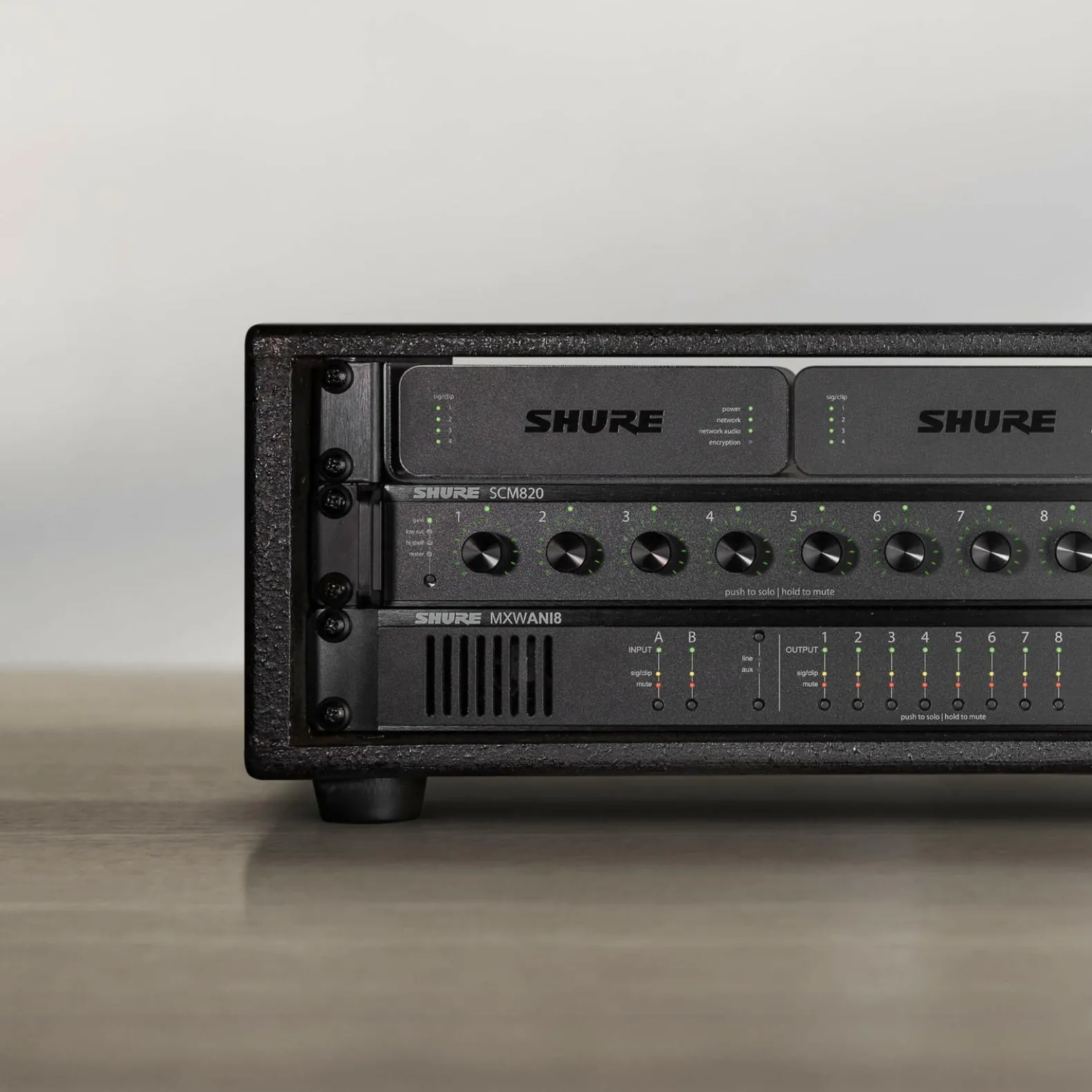Converts up to four line / mic analog signals onto a Dante network for easy audio routing and browser-based control.