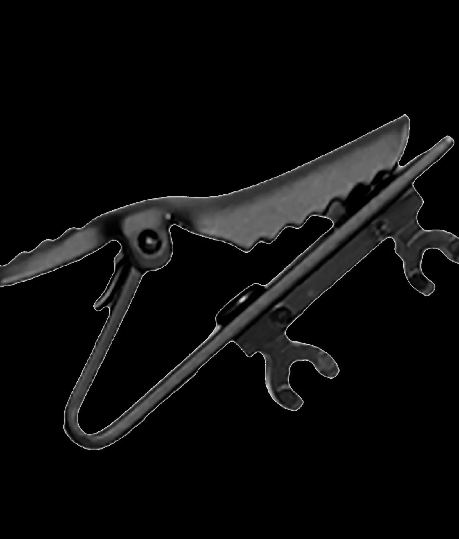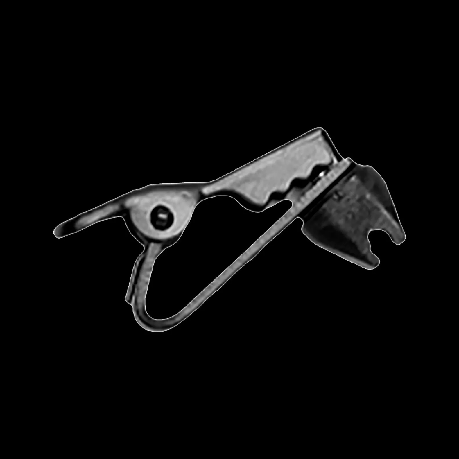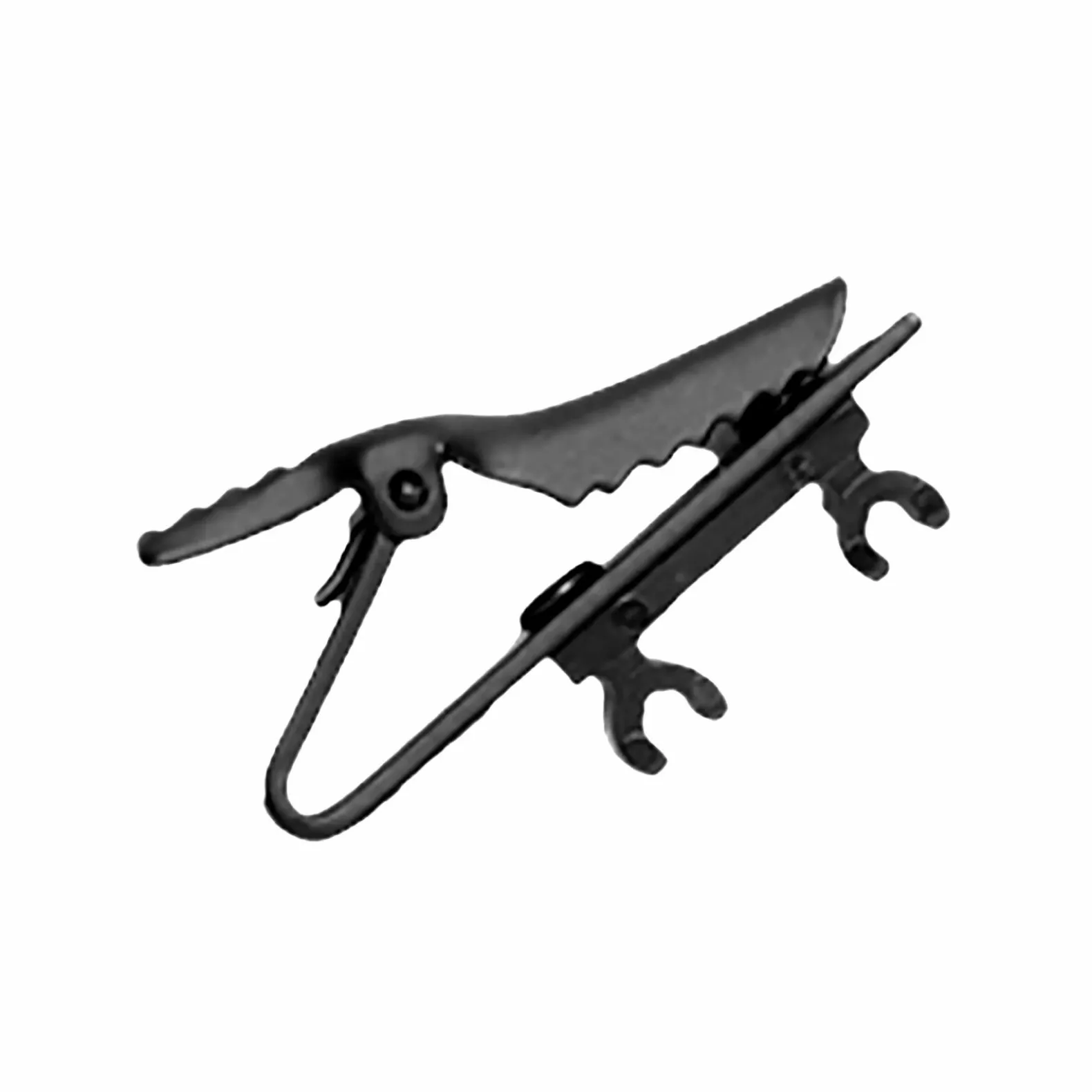 Black single and dual tie clip secures WL50, WL51, MC50B, and MC51B microphones to clothing.