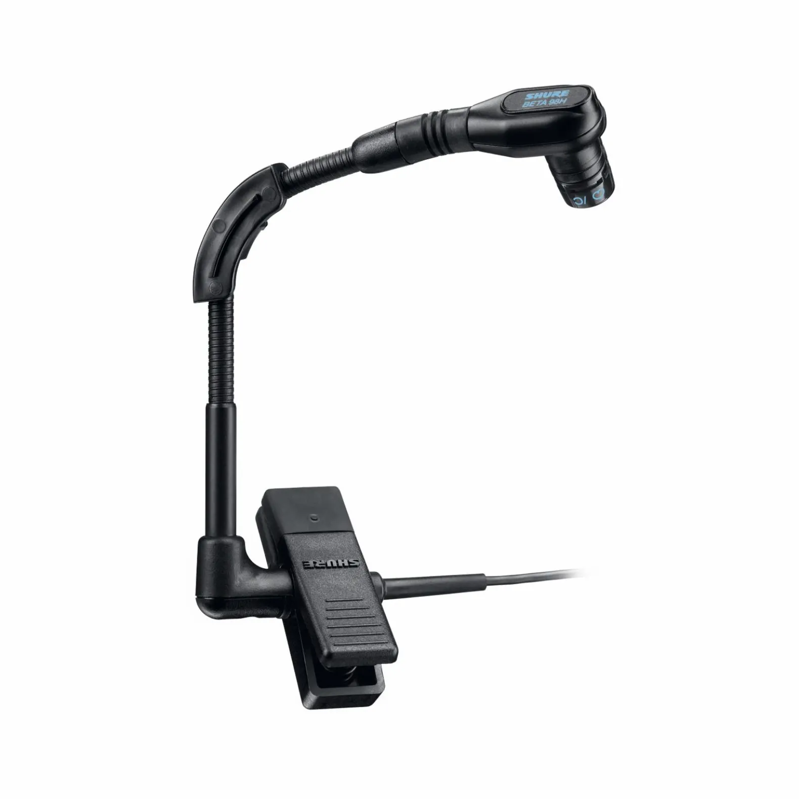 The Shure WB98H/C (the wireless version of the BETA®98H/C) is a premium cardioid condenser instrumental microphone that clamps onto the bell of wind instruments or onto the rim of percussion instruments. The integrated gooseneck and ratcheting swivel joint allows the microphone to be easily positioned and secured in place, and an isolation shock-mount reduces the transmission of instrument ‘key noise’ and other mechanical noise. A gooseneck angle brace is included to provide better retention of the microphone placement during more active performances.