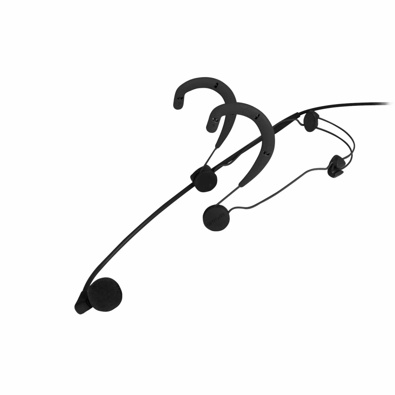 The microphone features a durable, low-profile wire frame headband which is fully adjustable for stability and comfort. A plastic carrying case protects the microphone and its accessories.